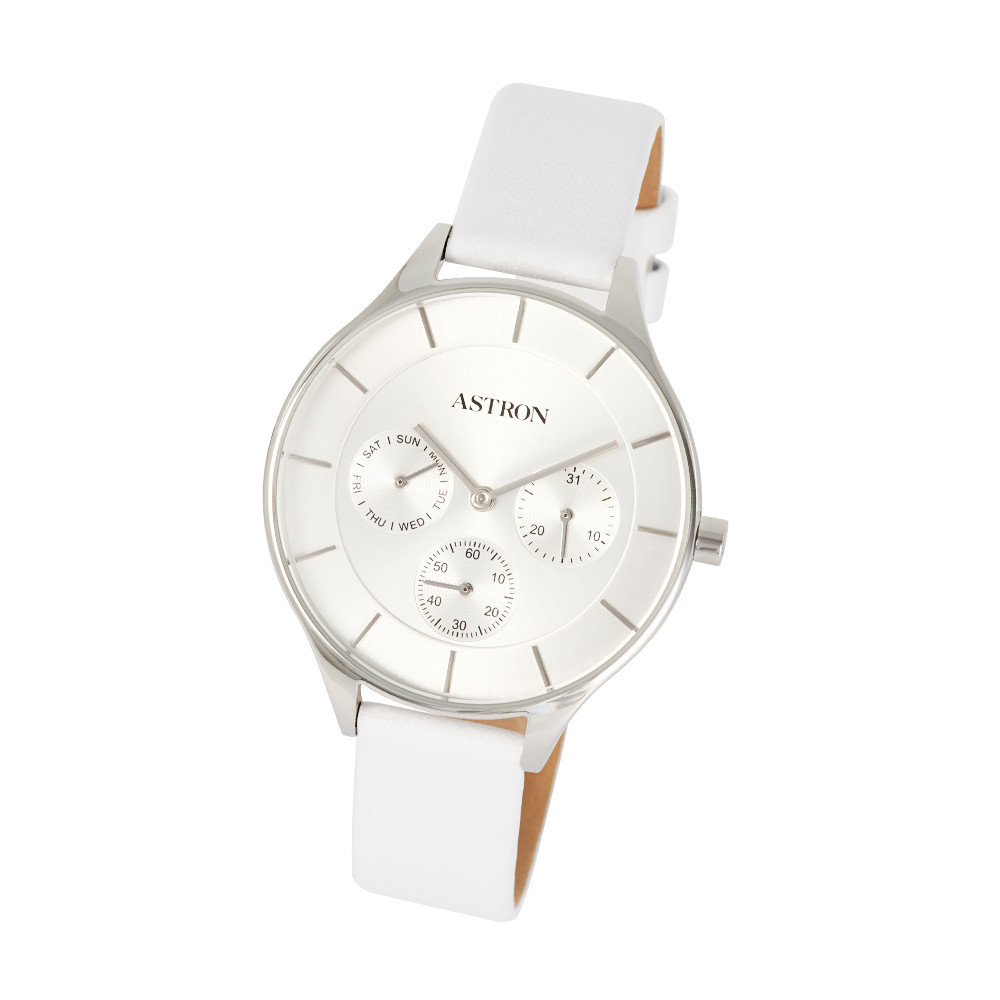 ASTRON 8016-8 elegáns női karóra, ezüst színű nemesacél tok, fehér bőrszíj, ezüst számlap, keményített ásványüveg, multifunkciós quartz szerkezet, cseppmentes vízállóság