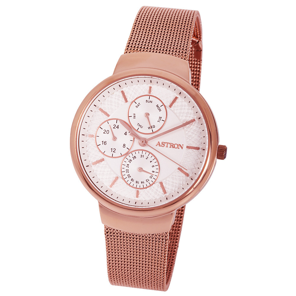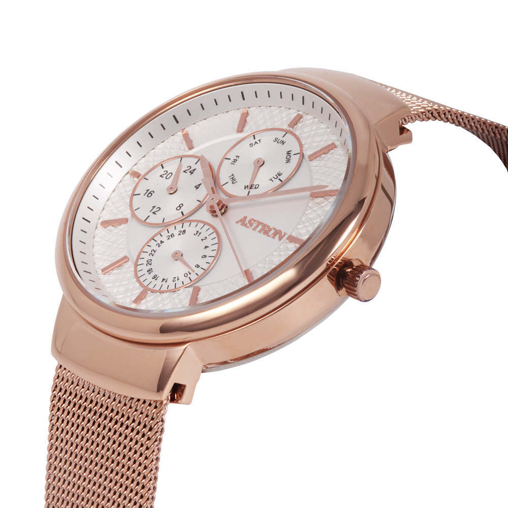 ASTRON 8017-0 divatos női karóra, rózsaarany színű nemesacél tok, rózsaarany színű nemesacél csat, fehér számlap, keményített ásványüveg, quartz szerkezet, cseppmentes vízállóság