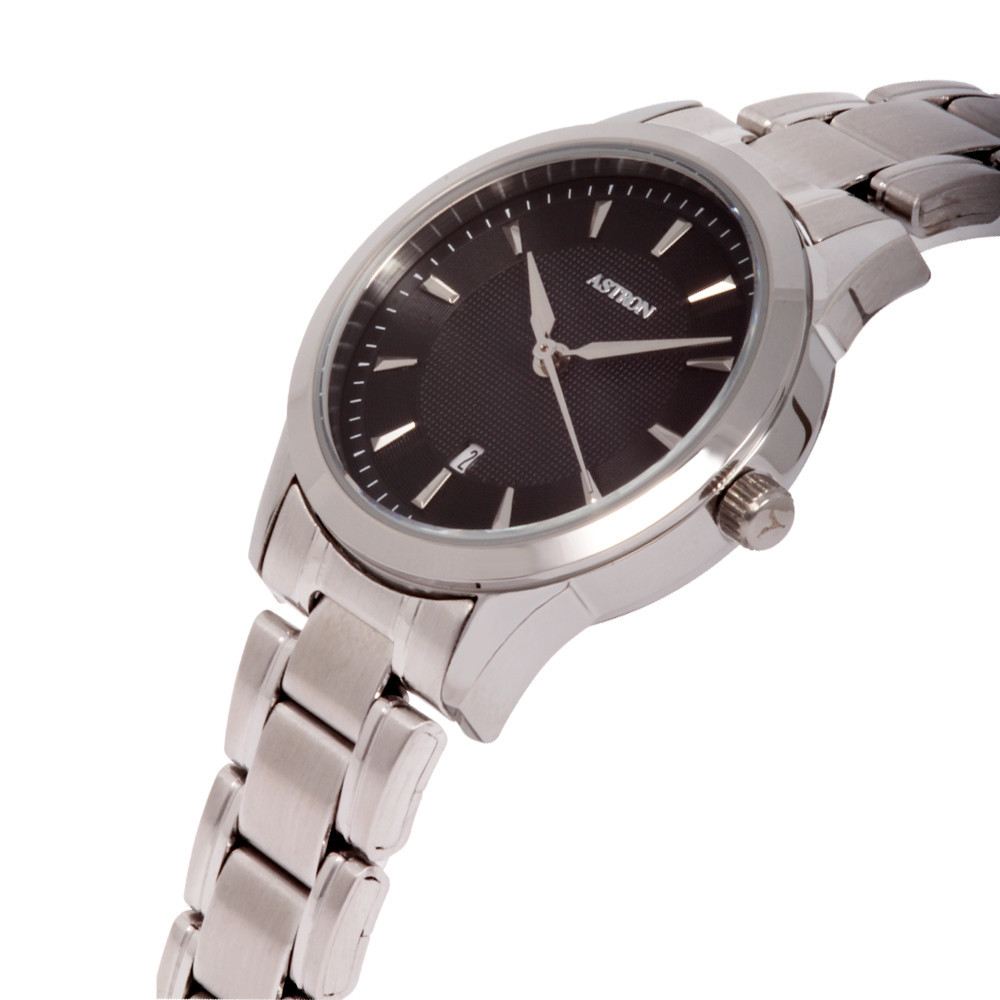 ASTRON 8018-1 elegáns női karóra, ezüst színű nemesacél tok, ezüst színű nemesacél csat, fekete számlap, keményített ásványüveg, quartz szerkezet, cseppmentes vízállóság