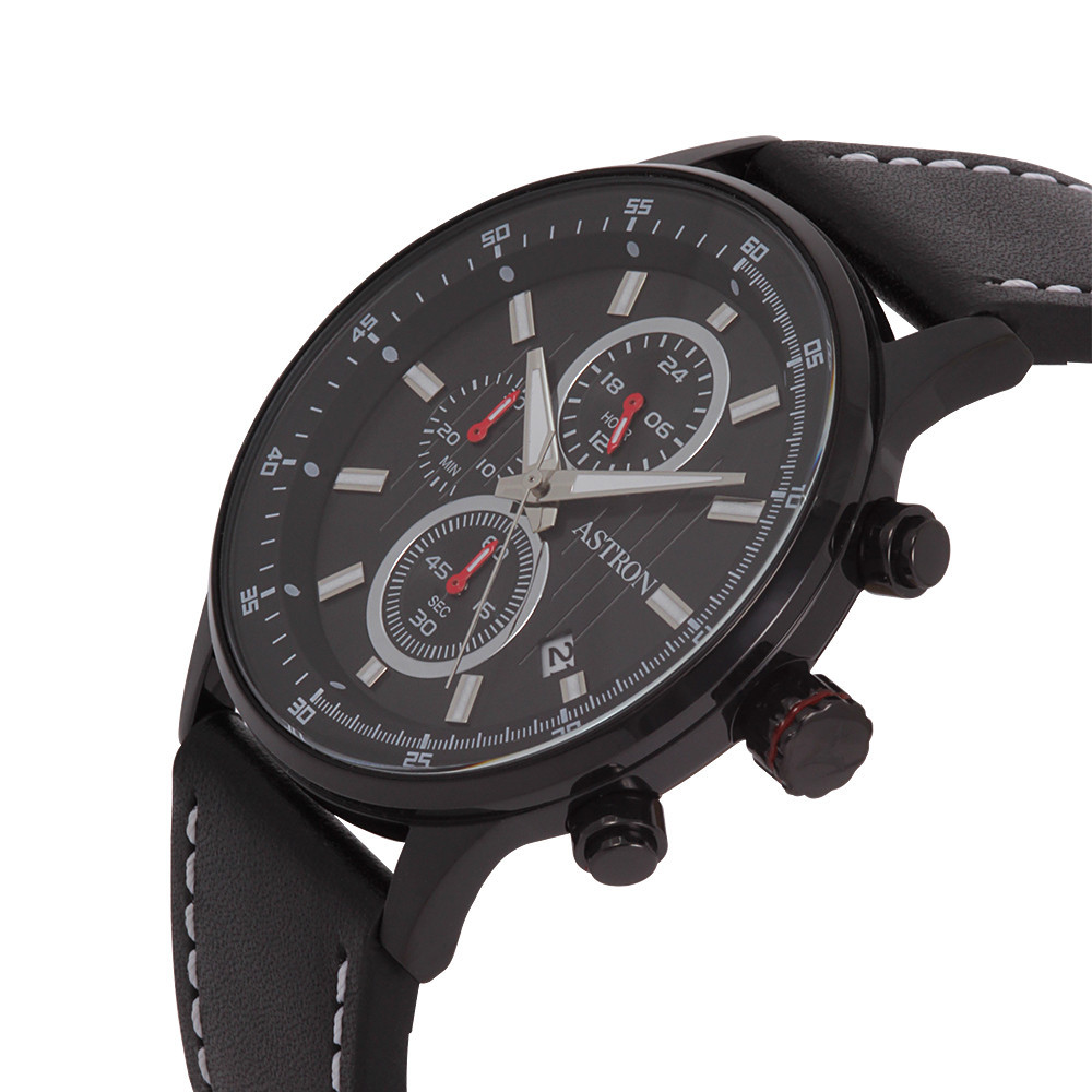 ASTRON 8030-1 sportos férfi karóra, chronograph, fekete színű nemesacél tok, fekete bőrszíj, fekete számlap, keményített ásványüveg, quartz szerkezet, 100 m (10 ATM) vízállóság