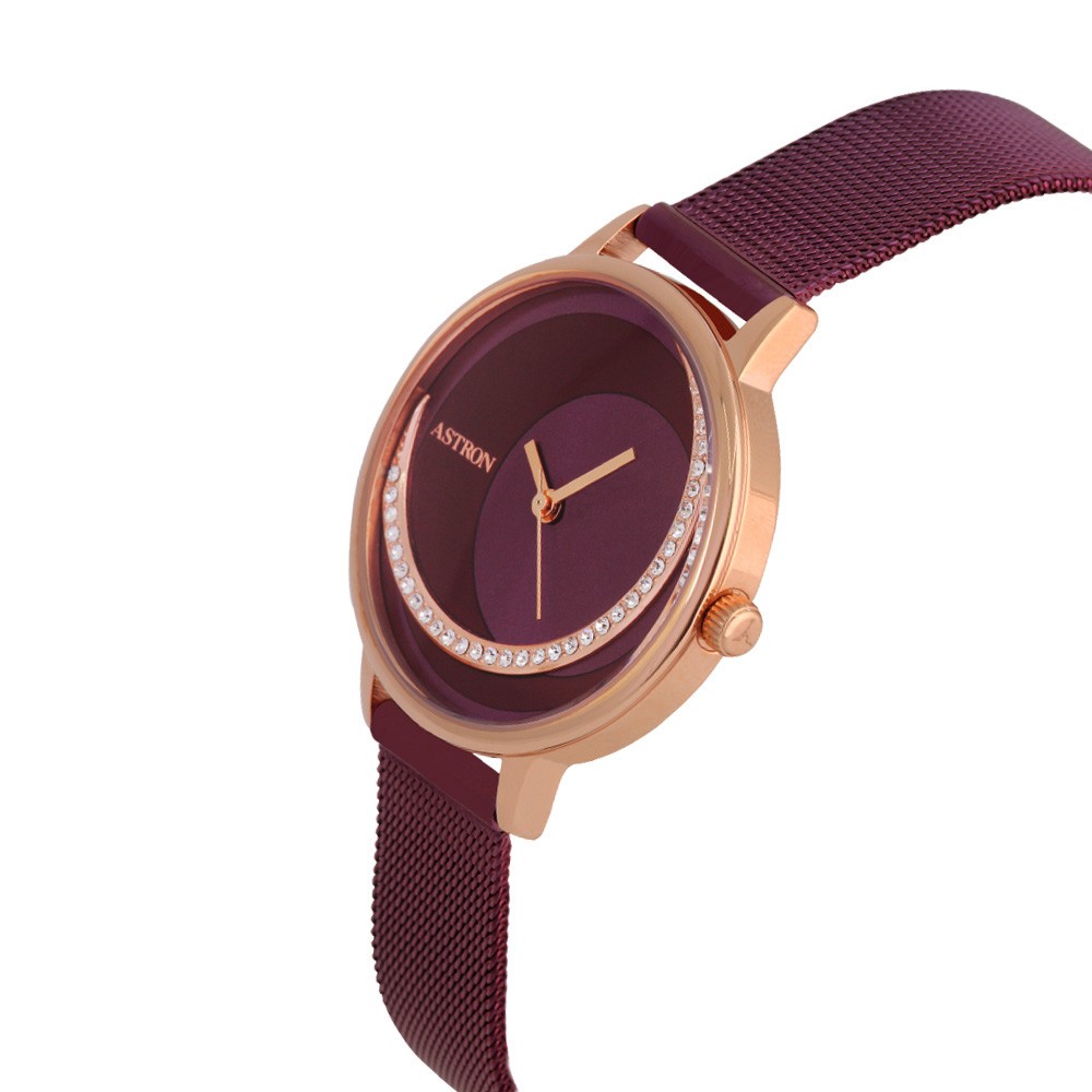 ASTRON 8032-3 női karóra, ékszeróra, rózsaarany színű nemesacél tok, lila nemesacél csat, lila számlap, keményített ásványüveg, quartz szerkezet, cseppmentes vízállóság
