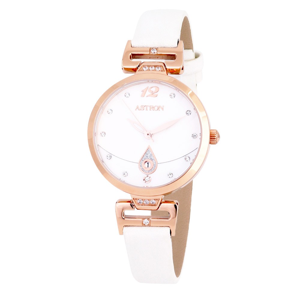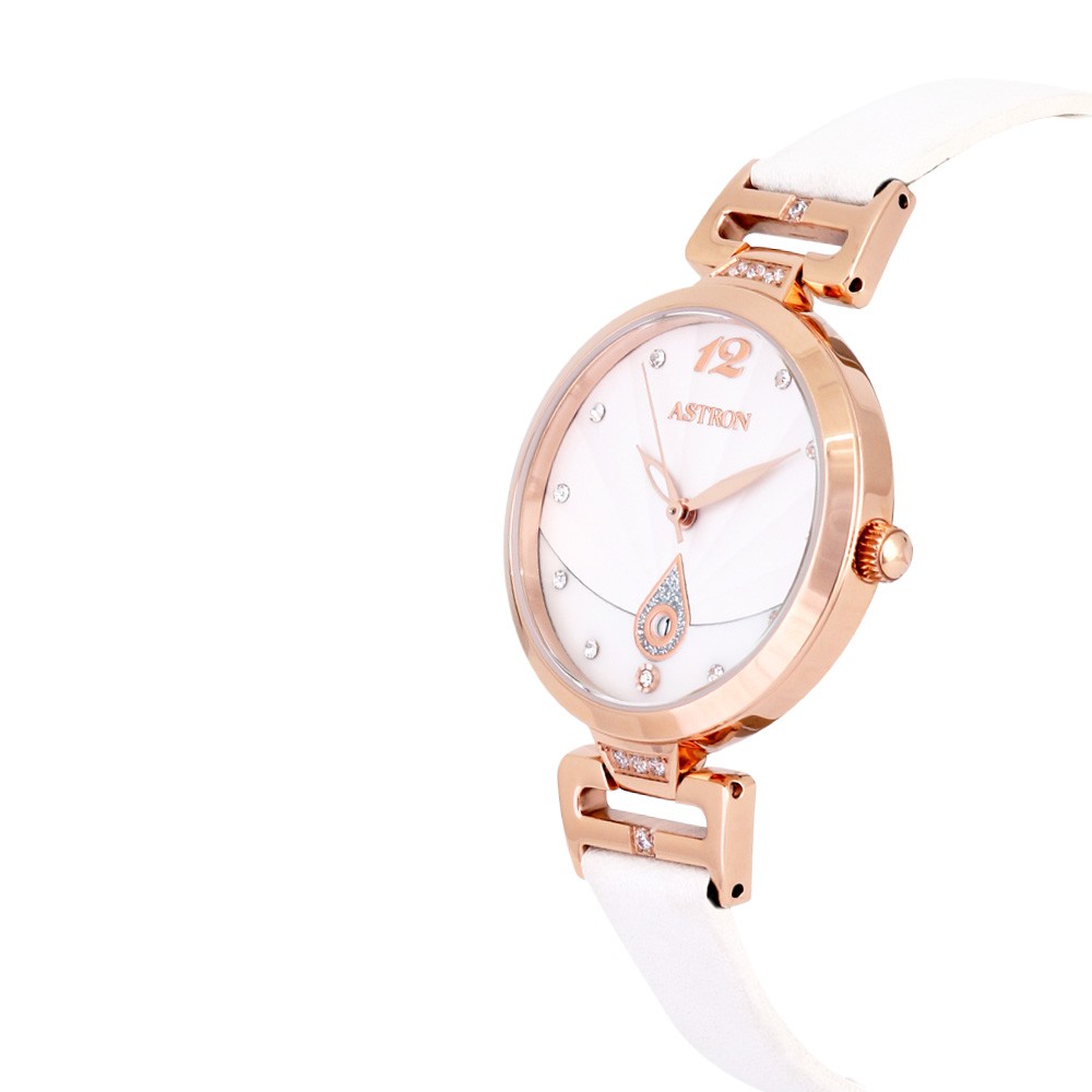 ASTRON 8037-0 női karóra, ékszeróra, rózsaarany színű nemesacél tok, fehér színű bőrszíj, fehér színű számlap, keményített ásványüveg, quartz szerkezet, cseppmentes vízállóság