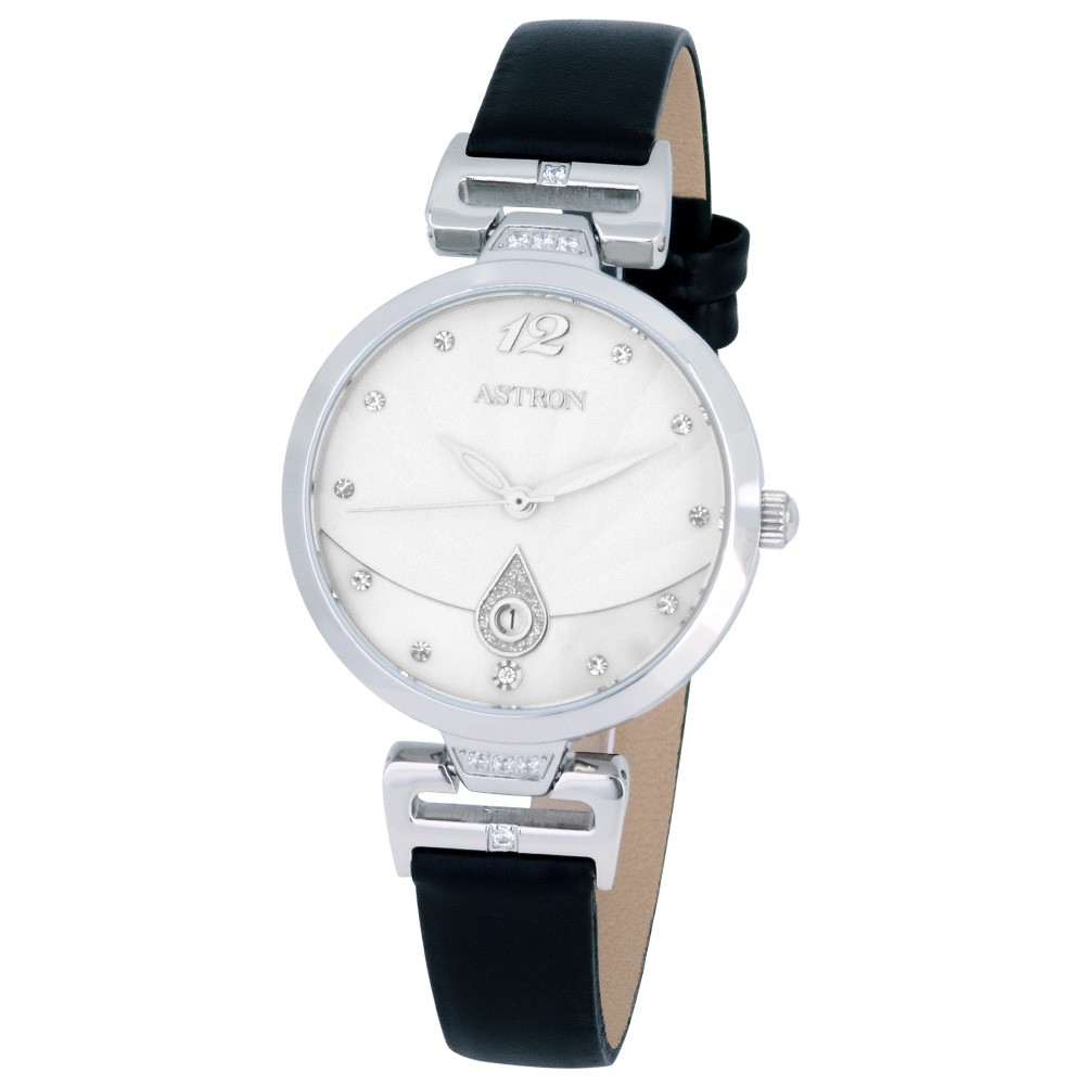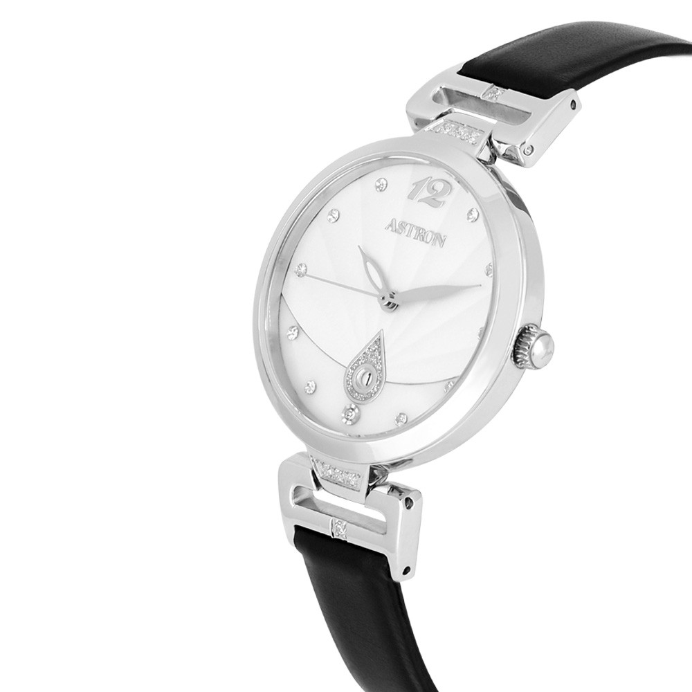 ASTRON 8037-7 női karóra, ékszeróra, ezüst színű nemesacél tok, fekete színű bőrszíj, különleges számlap, keményített ásványüveg, quartz szerkezet, cseppmentes vízállóság