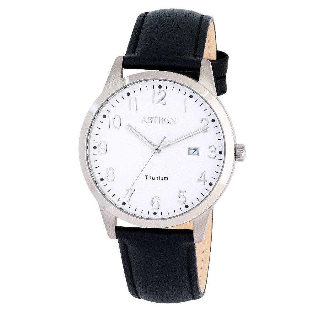 ASTRON 8043-8 férfi karóra, ezüst színű titánium tok, fekete bőrszíj, fehér számlap, keményített ásványüveg, quartz szerkezet, 50 m (5 ATM) vízállóság