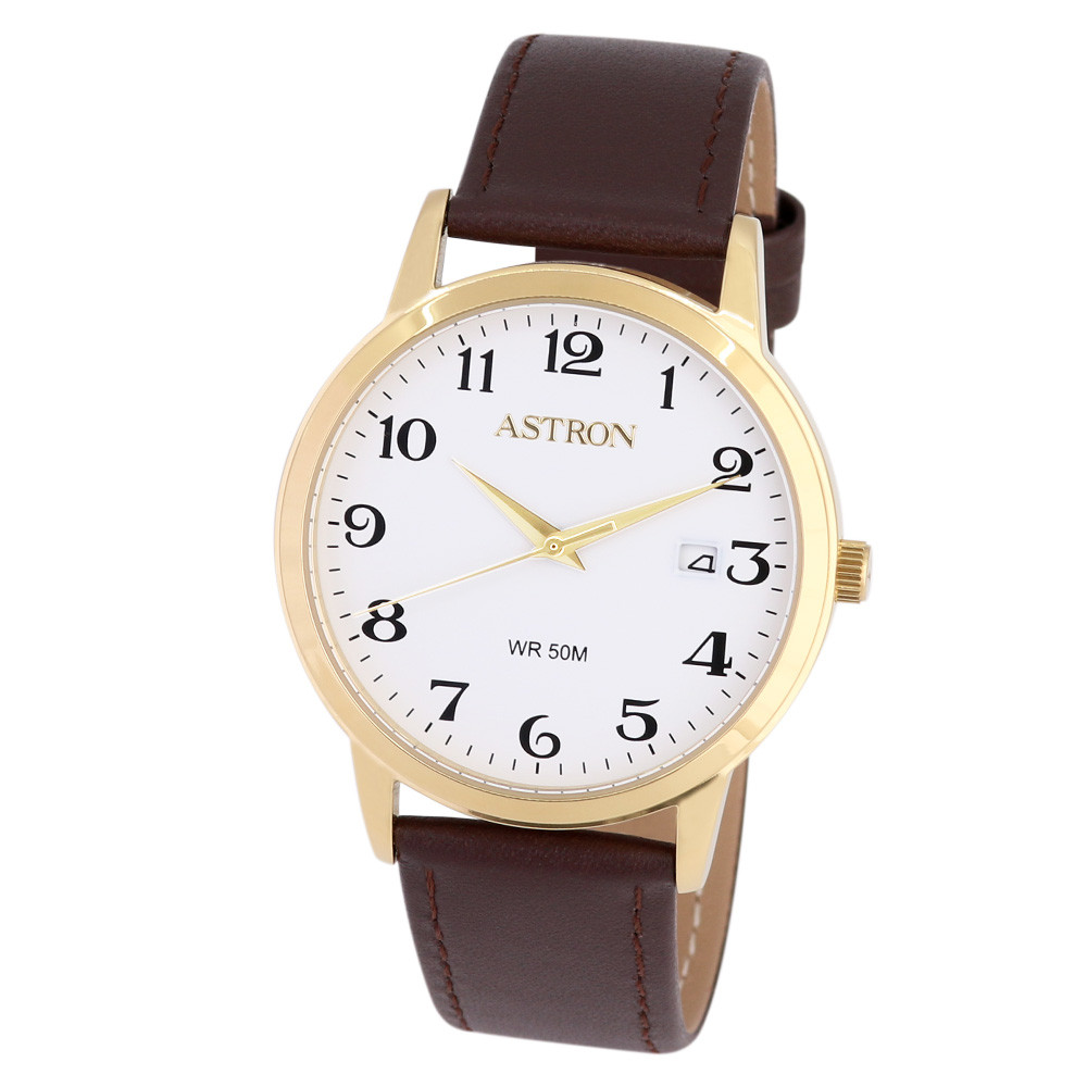 ASTRON 8046-9 férfi karóra, arany színű nemesacél tok, barna színű bőrszíj, fehér számlap, keményített ásványüveg, quartz szerkezet, 50 m (5 ATM) vízállóság