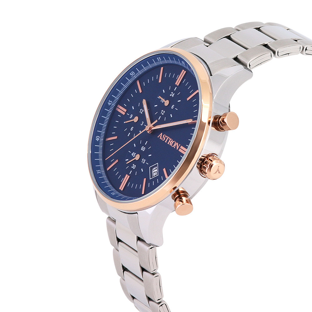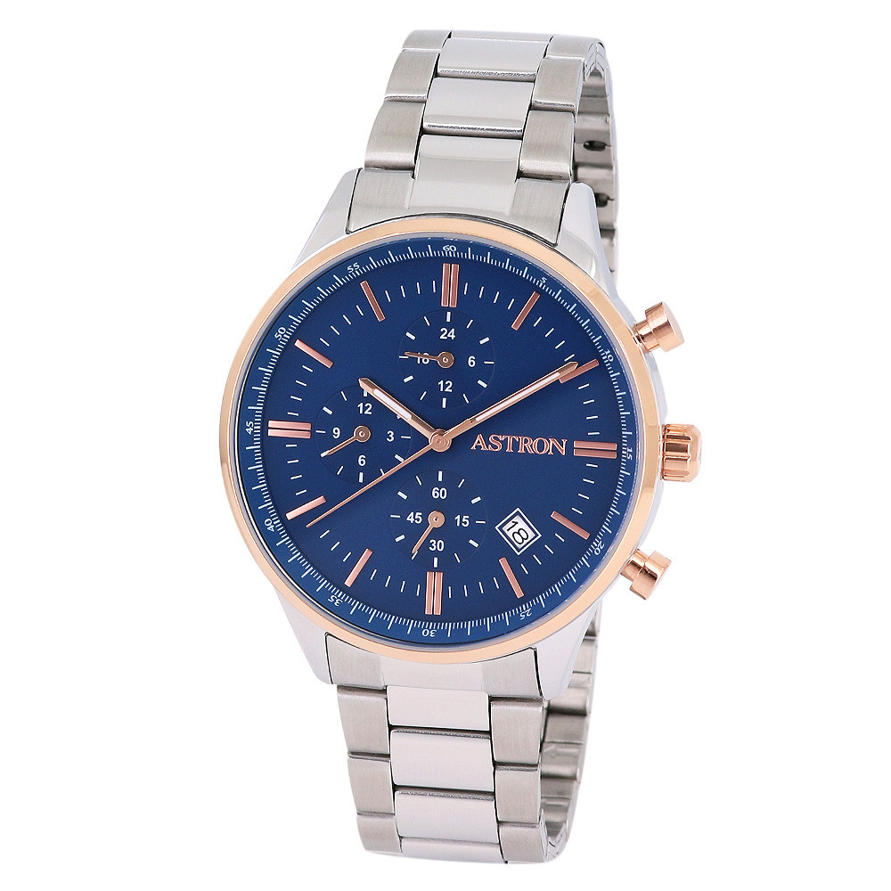 ASTRON 8049-2 férfi karóra, bicolor színű nemesacél tok, ezüst színű nemesacél csat, kék számlap, keményített ásványüveg, multifunkciós, quartz szerkezet, 50 m (5 ATM) vízállóság