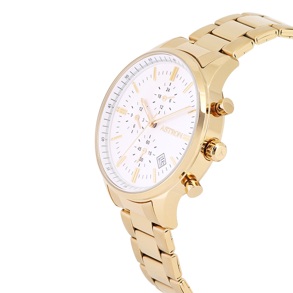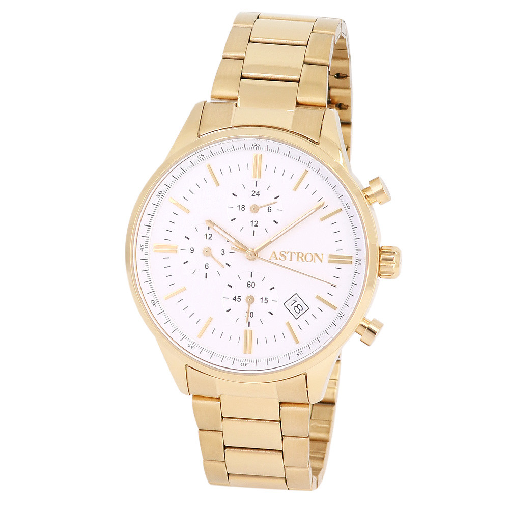 ASTRON 8049-8 férfi karóra, arany színű nemesacél tok és csat, ezüst színű számlap, keményített ásványüveg, multifunkciós, quartz szerkezet, 50 m (5 ATM) vízállóság