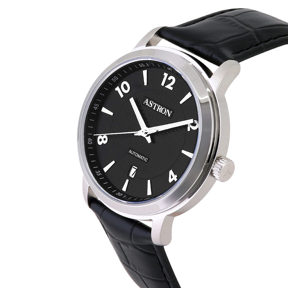 ASTRON 8052-1 férfi karóra, ezüst színű anemesacél tok, fekete színű bőrszíj, fekete számlap, keményített ásványüveg, mechanikus automata szerkezet, WR50M vízállóság