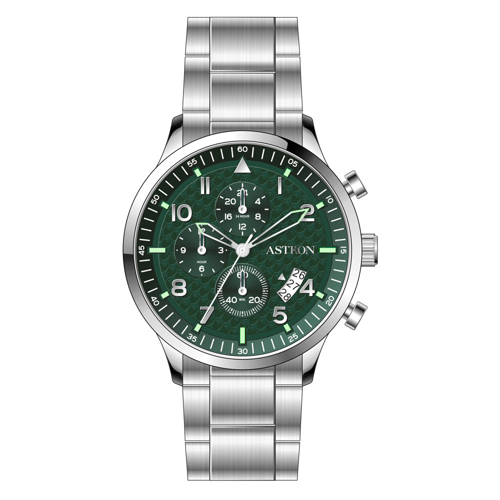 ASTRON 8059-3 férfi karóra, ezüst színű nemesacél tok, ezüst színű nemesacél csat, zöld számlap, keményített ásványüveg, quartz szerkezet, 5 ATM vízállóság