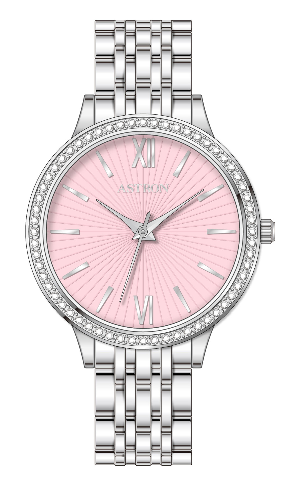Rózsaszín sugaras számlap ragyogó kő díszítéssel
