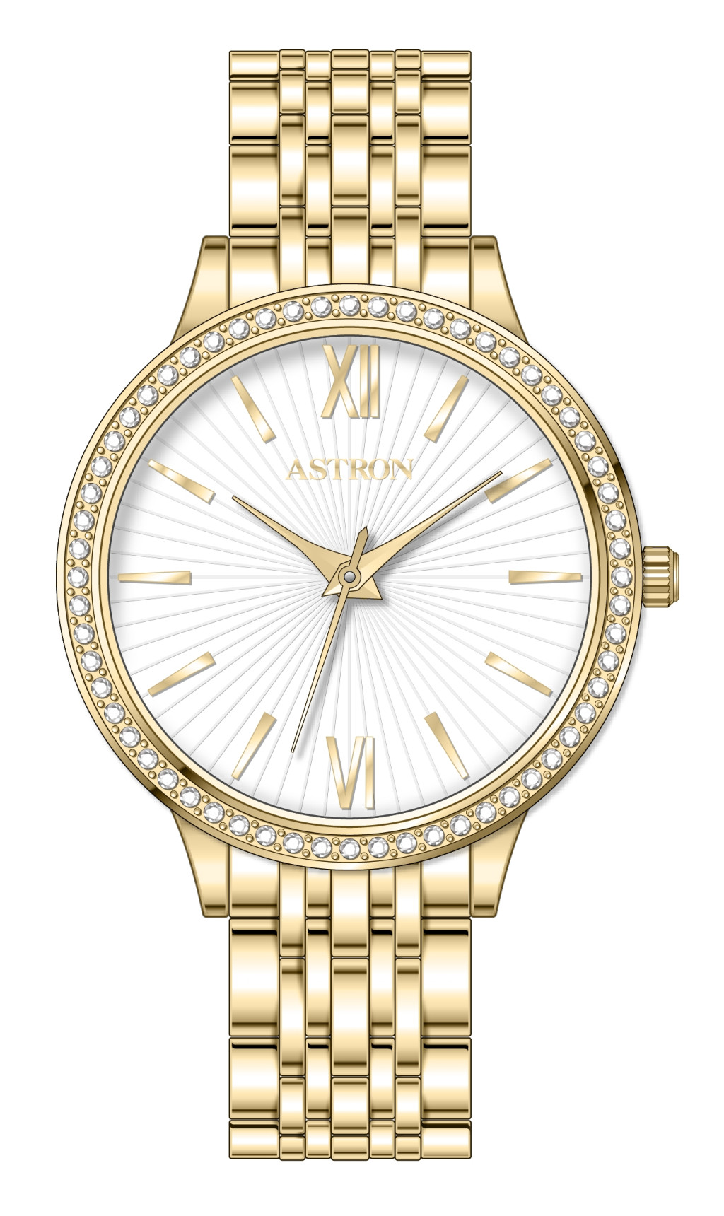A karóra egyik legszebb részlete a finom, sugaras textúrával ellátott fehér analóg számlap. Az idő leolvasását a klasszikus arany színű római számok és az elegáns vonalindexek teszik egyszerűvé. A valódi ékszer jelleget a tok peremén (lünettáján) sűrűn körbefutó, szikrázó kő díszítés biztosítja. A számlapot és a mutatókat keményített ásványüveg óvja a mindennapos karcolásoktól és fizikai behatásoktól.