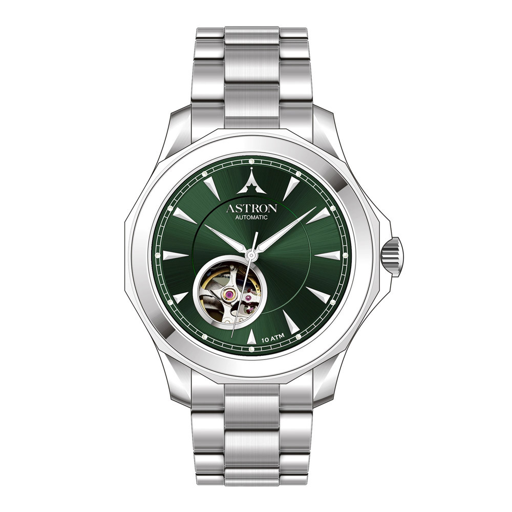 Smaragdzöld napsugár csiszolt számlap látható szerkezettel és zafír üveg