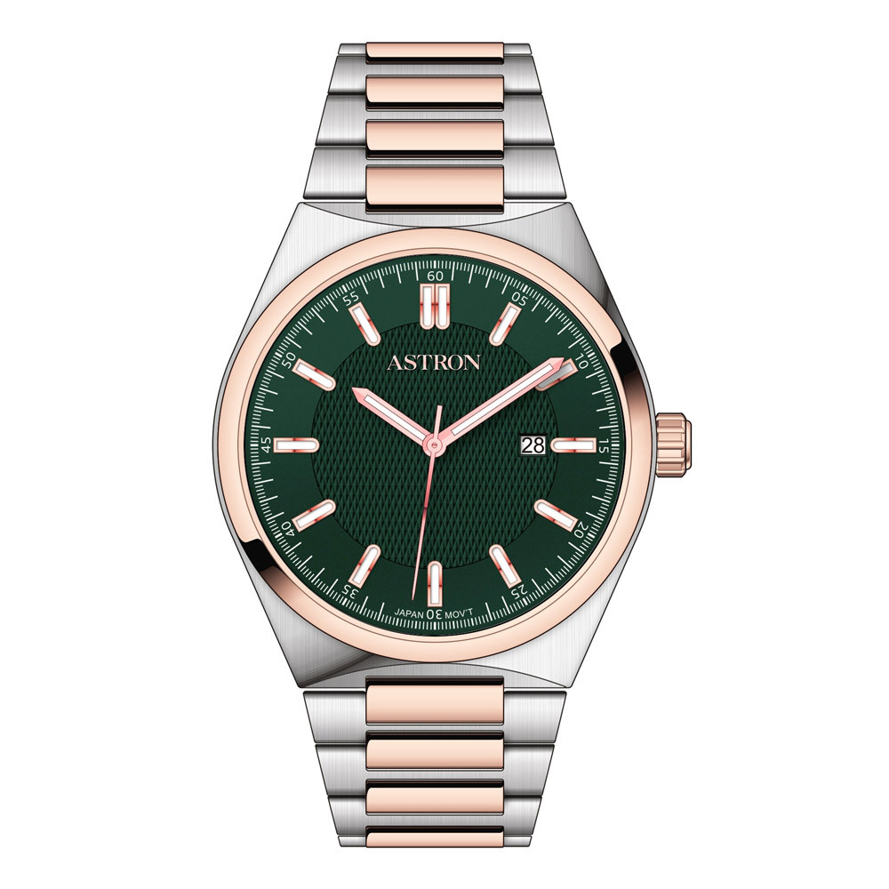 Textúrázott zöld számlap rózsaarany részletekkel és ásványüveg